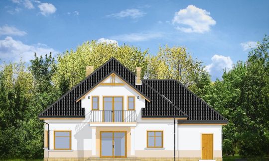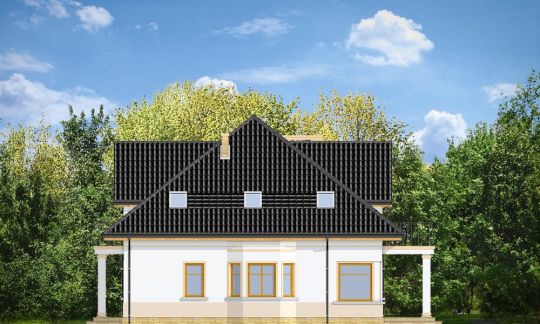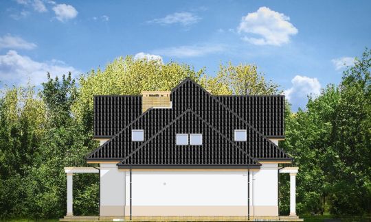 Projekt domu Amanda to budynek jednorodzinny dla cztero-sześcioosobowej rodziny. Amanda to dom piętrowy, przykryty czterospadowym dachem. Projekt domu Amanda jest podmiejską willą o nowoczesnej, ale spokojnej architekturze. Zwarta bryła budynku z dobudowanym garażem i dużym zadaszonym podcieniem z tyłu domu, została ciekawie ozdobiona klinkierowymi i drewnianymi okładzinami elewacji, oraz loggiami i podcieniem wejściowym. Masywny ozdobny komin kominka wewnętrznego i zewnętrznego, czy narożne okna - to dodatkowe ozdoby budynku. Przemyślana architektonicznie bryła tworzy spójną, spokojną kompozycyjnie całość. Na parterze zaprojektowano duży salon z jadalnią i holem, z częściowo otwartą kuchnią, oraz dodatkowy pokój - gabinet lub sypialnię gościnną. Na piętrze znajdują się sypialnie, z odrębnym apartamentem rodziców, z własną łazienką, garderobą i balkonem z widokiem na ogród. W projekcie Amanda, przez szerokie przeszklenia na parterze zaplanowano wyjście z salonu do dużego podcienia i na taras ogrodowy. Dostępna jest także wersja odbicia lustrzanego projektu Amanda.